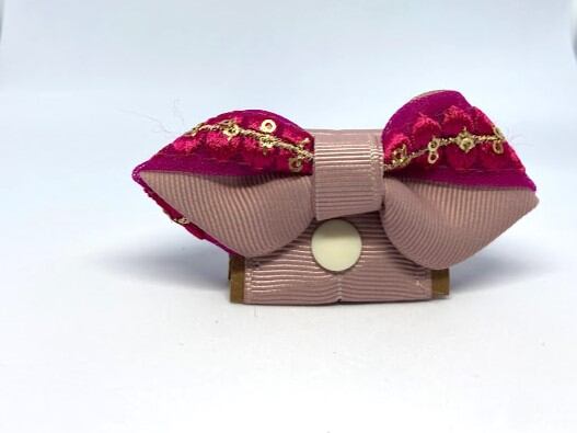 鮮やかなピンクのインド刺繍リボンと上品なグログランリボンを組み合わせた蝶ネクタイのような迷子札ケースです。首輪にプラスするだけでおしゃれなアクセントになります。