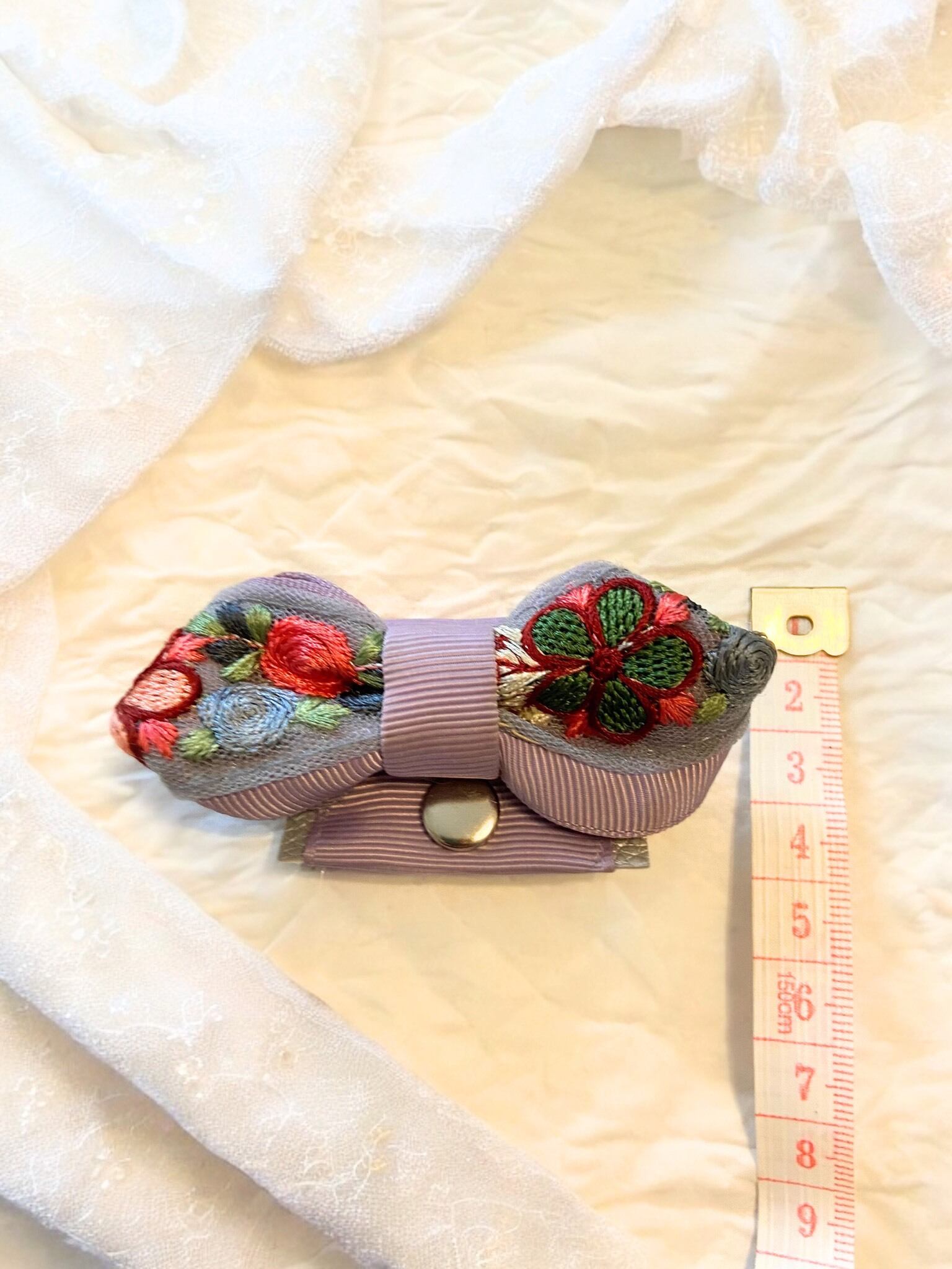 華やかで鮮やかなインド刺繍リボンと上品なすみれ色のグログランリボンを組み合わせた蝶ネクタイのような迷子札ケースです。首輪にプラスするだけでおしゃれなアクセントになります。