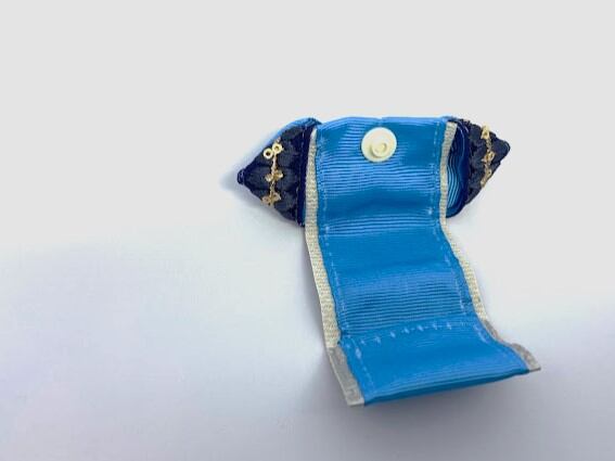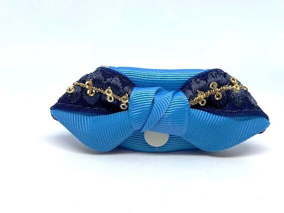 紺とゴールドの華やかなインド刺繍リボンと上品なブルーのグログランリボンを組み合わせた蝶ネクタイのような迷子札ケースです。首輪にプラスするだけでおしゃれなアクセントになります。
