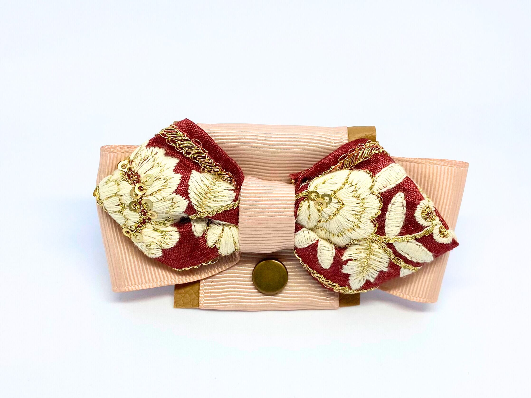 華やかな赤のインド刺繍リボンと上品なグログランリボンを組み合わせた蝶ネクタイのような迷子札ケースです。首輪にプラスするだけでおしゃれなアクセントになります。