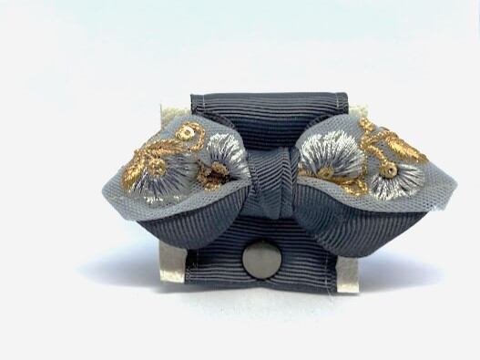 グレーにゴールドの花柄のシックななインド刺繍リボンと上品なチャコールのグログランリボンを組み合わせたちょっと大人な雰囲気の蝶ネクタイのような迷子札ケースです。首輪にプラスするだけでおしゃれなアクセントになります。